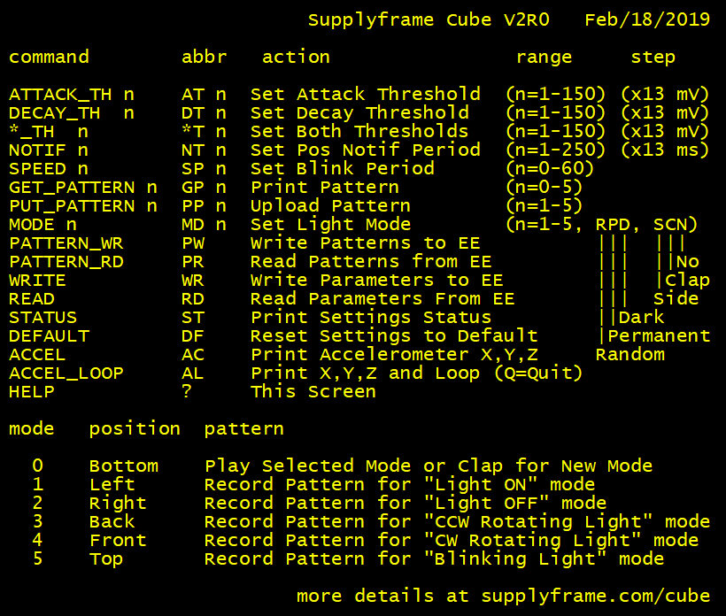 状态 (STATUS) 命令用于读取魔方当前状态: 起始阈值 (Attack)、衰减阈值 (Decay)、通知时长 (Notification)、延迟系数 (Speed) 和模式 (Mode)。所有列出的参数都可以通过输入 DEFAULT 来重置默认状态,我们会在后面的“高级命令”中详谈这些参数。