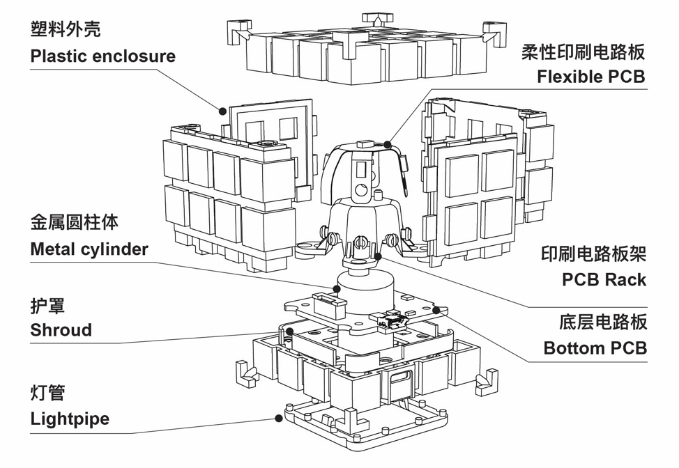 魔方内置两种指示灯。一种位于魔方底部,由 10 个 LED 组成,称为副灯;另一种位于魔方顶部,由 5 个大功率 LED 组成,称为主灯。默认状态下,底部指示灯随机闪烁,可以通过模式(MODE) 命令 关闭 (OFF) 或永久打开 (ON),可设置 R (随机)、P (永久) 或 D (熄灭)。默认状态下,顶部指示灯常亮 (MODE 1) ,它也可以被关闭 (MODE 2)、逆时针依序发亮 (MODE 3)、顺时针依序发亮 (MODE 4) 或闪烁 (MODE 5)。请注意,每个命令可输入双字符缩写代替。