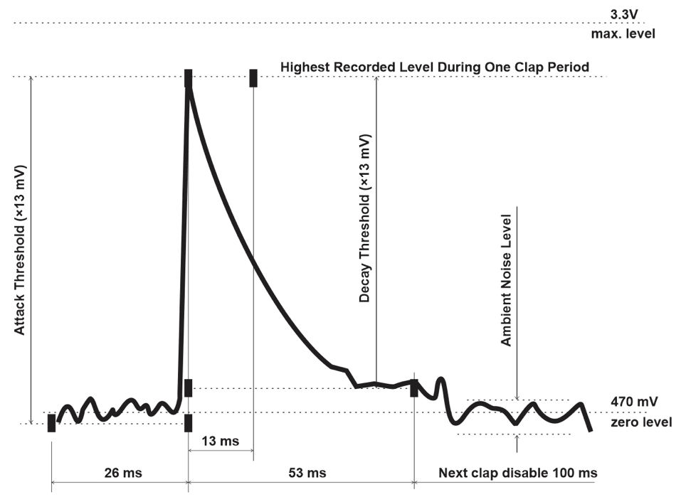 You can also switch the mode by clapping your hands, or by beating with some object on your table. To perform this, you must record your patterns for every mode separately, and these patterns will be your "passwords" for turning lights on and off. See next PATTERN PROGRAMMING for details.