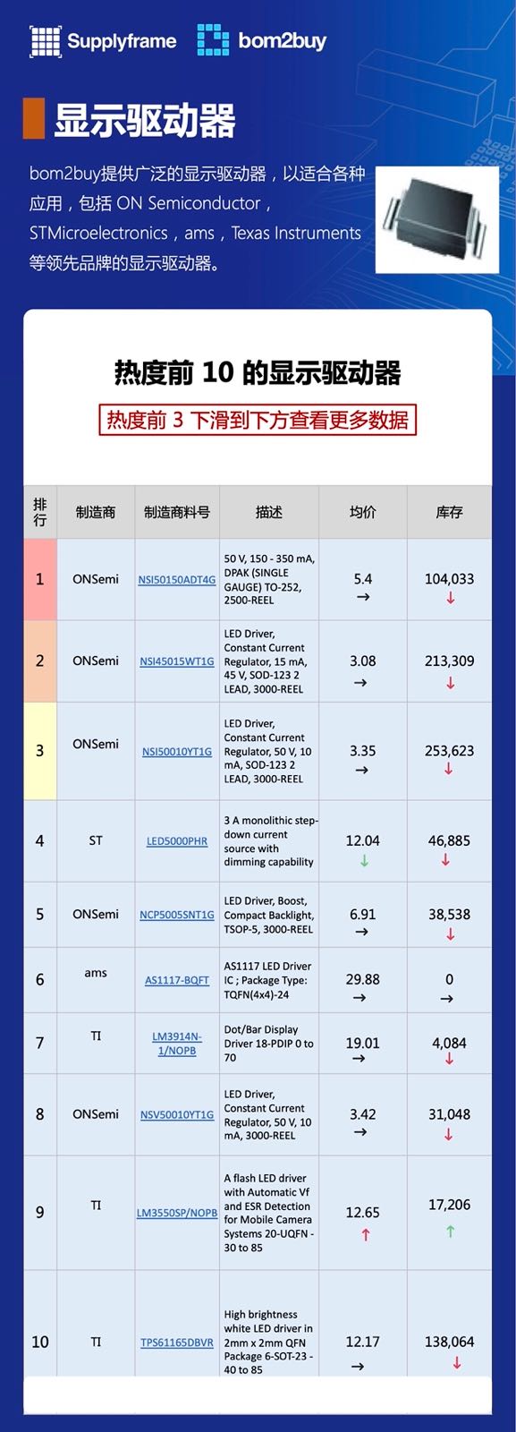 热度前10的显示驱动器基本上被ONSemi,ST, ams, TI等大厂所包揽。